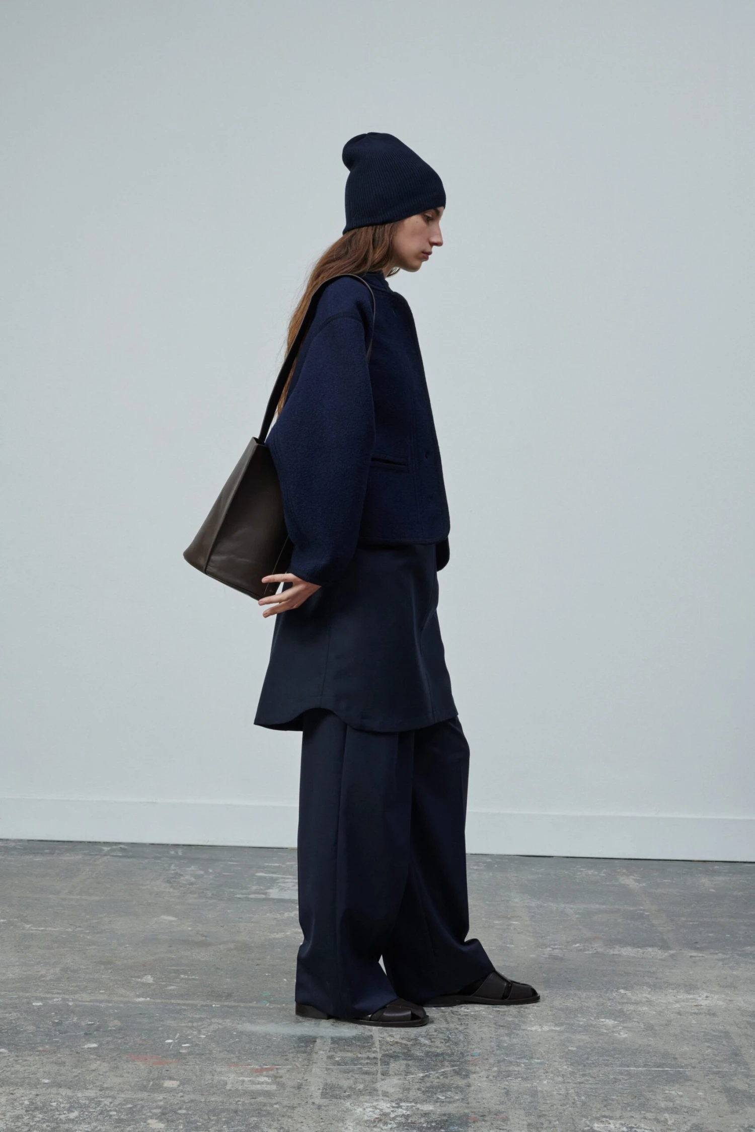 Bonnet fin en maille côtelée, en laine mérinos bleu marine.