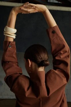Ce bracelet en rĂ©sine pare l’avant-bras et donne du caractère Ă un top retroussĂ© sur les manches.
