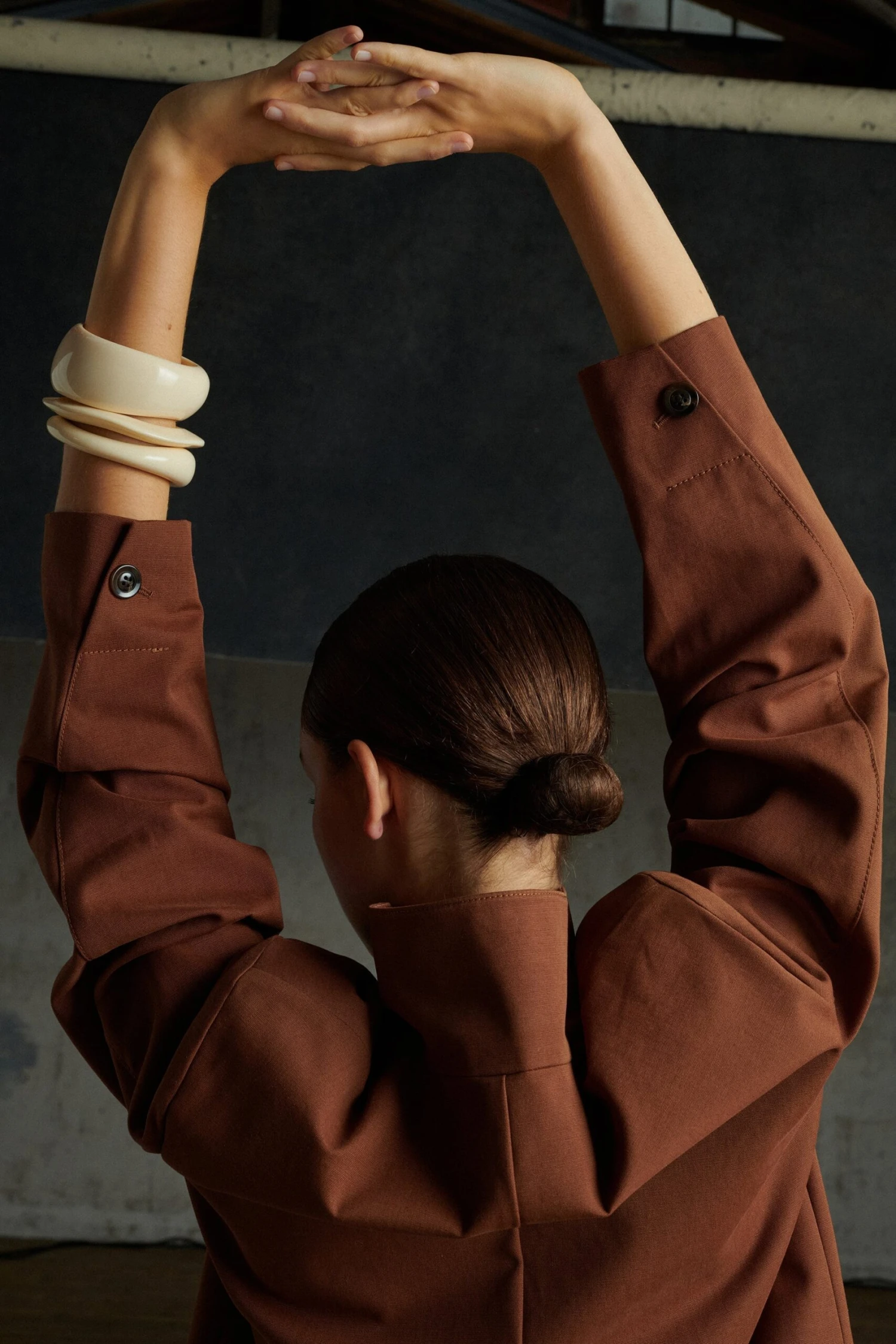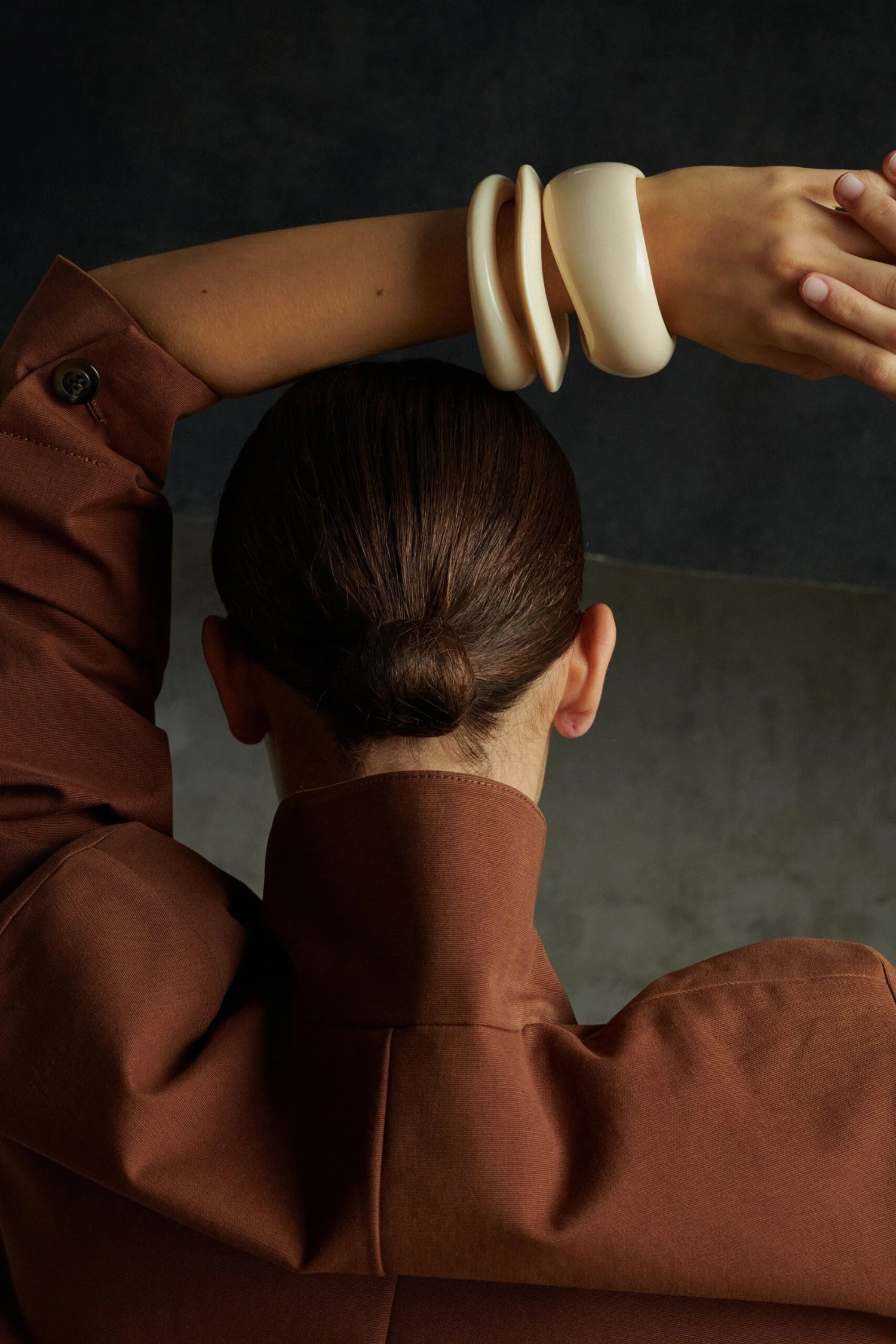 Ce bracelet en rĂ©sine pare l’avant-bras et donne du caractère Ă un top retroussĂ© sur les manches.