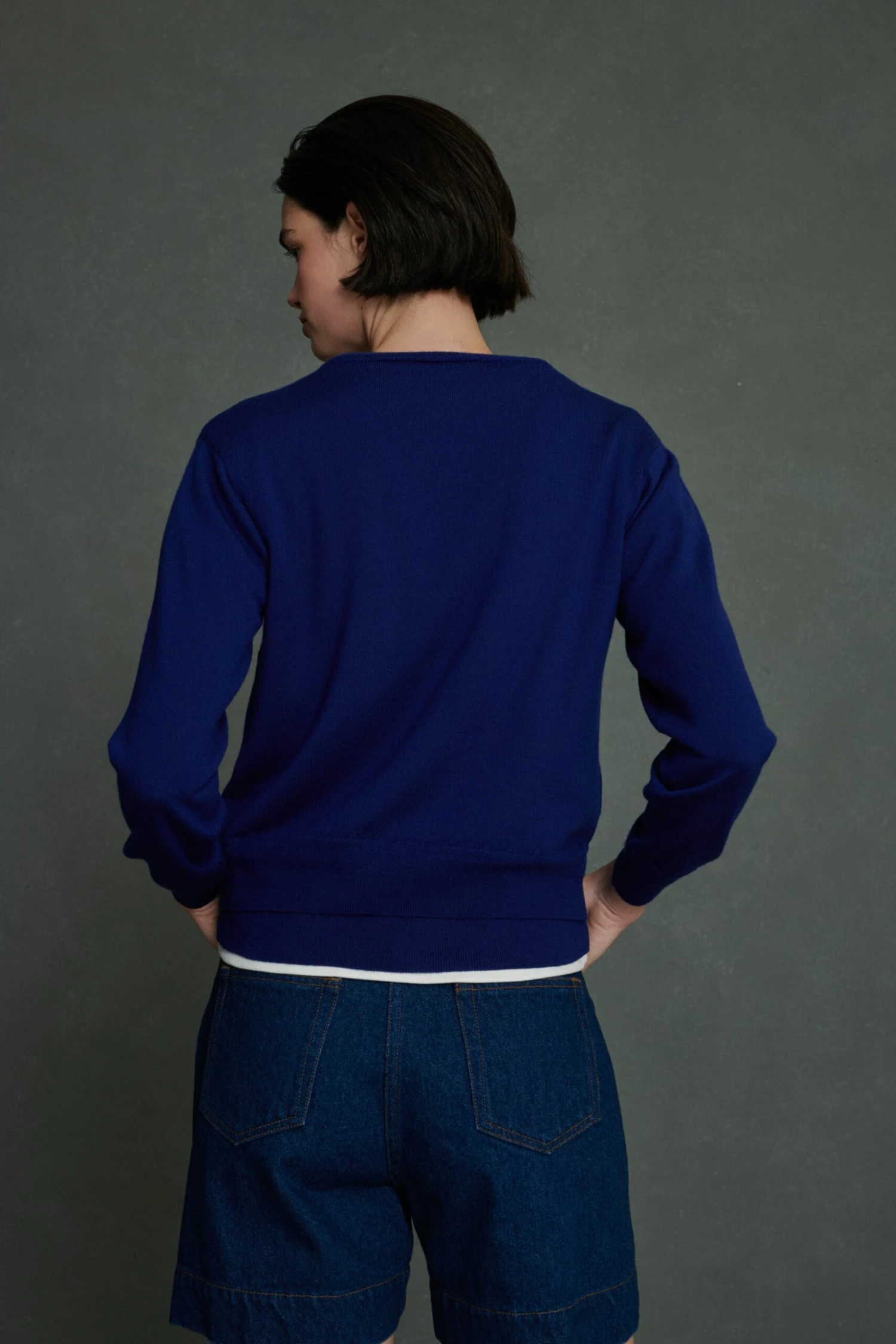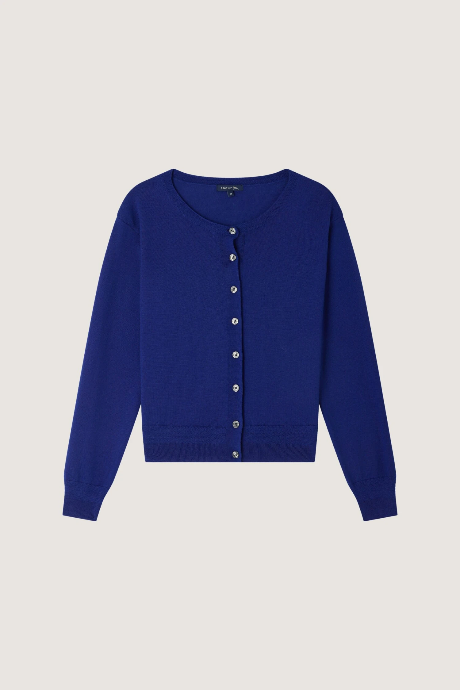 Cardigan boutonné à col rond en laine mérinos bleu électrique