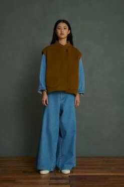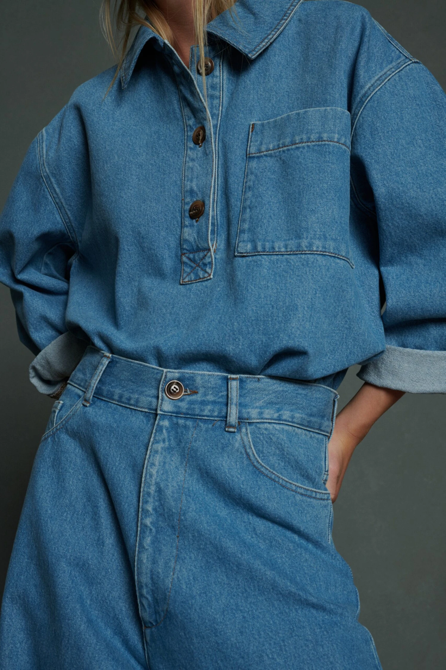 AUSTIN est un top en denim souple, inspiré des vareuses traditionnellement en toile épaisse. La toile de denim bleu clair est délavée, accentuant son allure vintage. A associer au jean ALEXIS ou au short AKI pour un total look rétro.