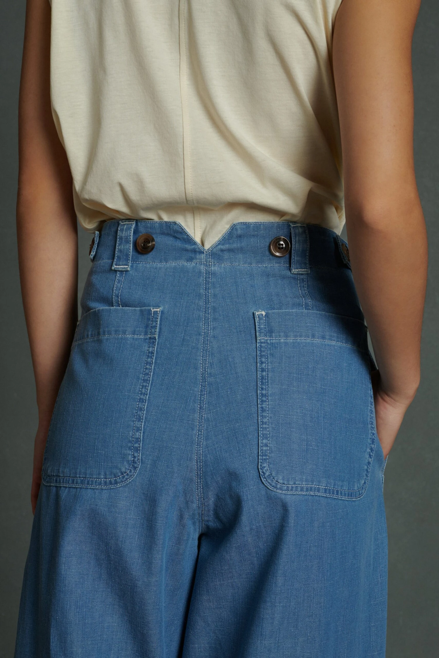 ALDO est un pantalon tissĂ© en chambray, une toile de coton lĂ©gĂšre. Des surpiqĂ»res contrastĂ©es apportent du relief au vĂȘtement. Une patte de boutonnage ajustable permet de le porter taille haute ou posĂ© sur les hanches. En bas de jambe, un bouton accentue l’arrondi de la silhouette, dĂ©boutonnĂ©, il offre une jambe droite.