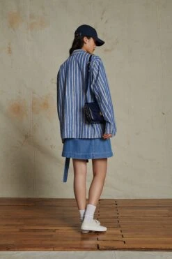 AIME est une jupe portefeuille asymĂ©trique qui reprend les codes des tabliers Ă nouer sur le cĂŽtĂ©. Elle est tissĂ©e en chambray, une toile plus lĂ©gĂšre que le denim adaptĂ©e Ă l’Ă©tĂ©. Des surpiqĂ»res contrastĂ©es apportent du relief au vĂȘtement.