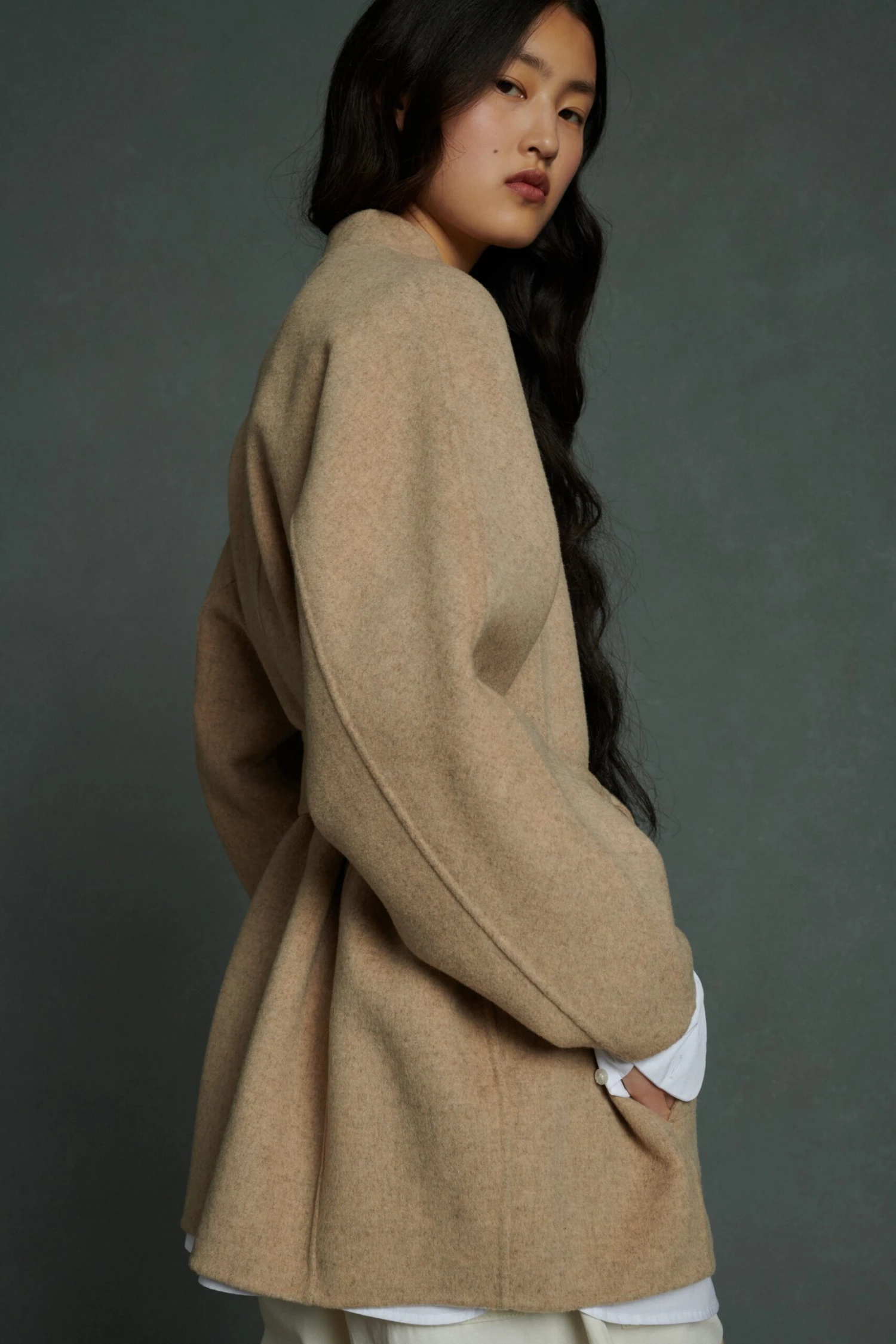 PRUSSE est un manteau à ceinturer en lainage chaud non doublé. Il présente de nombreux détails : finitions gansées qui soulignent les empiècements et les manches coudées, pied de col montant, poches insérées aux côtés, deux pattes de boutonnage (boutons nacrés dissimulés et pressions en métal brossé).
