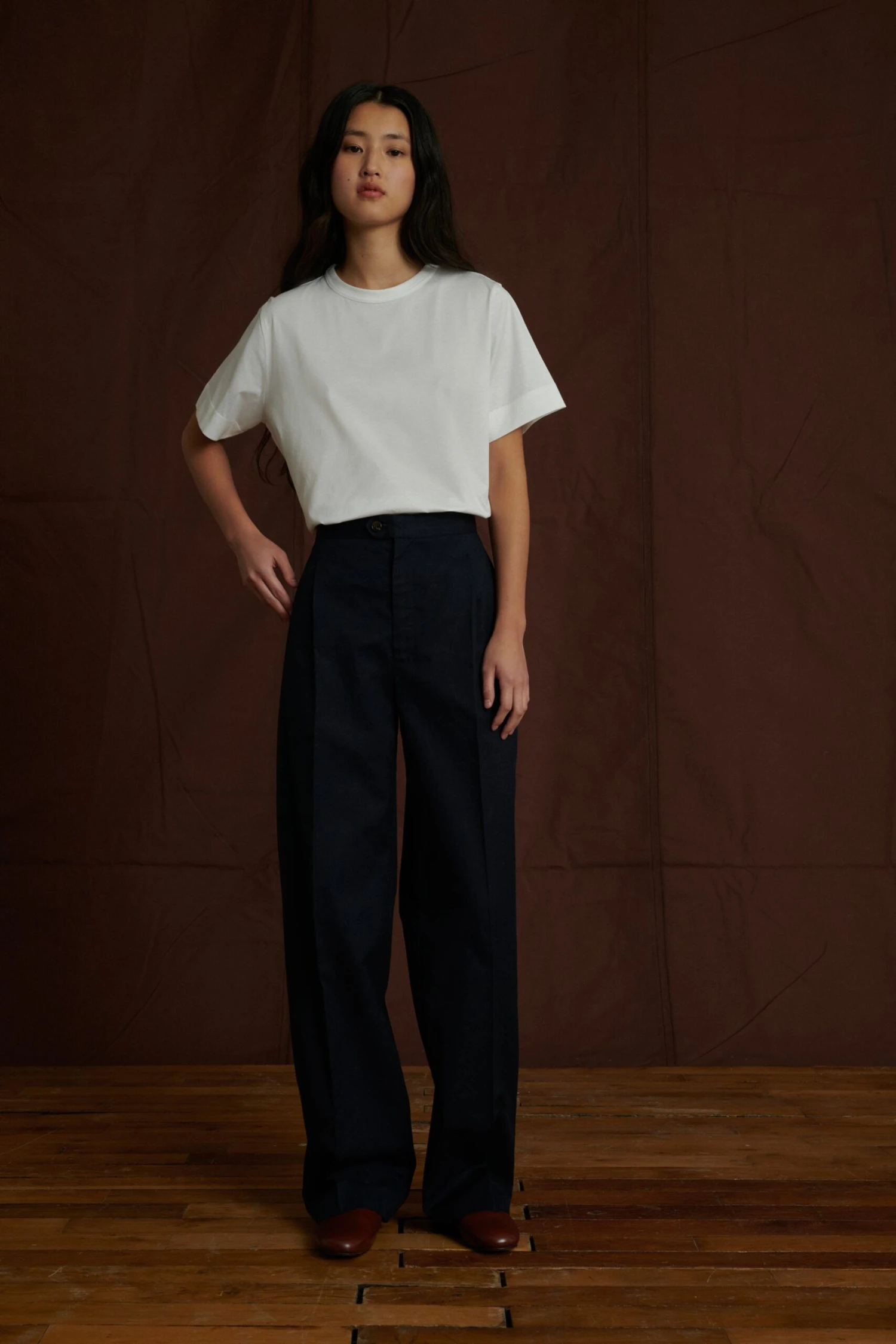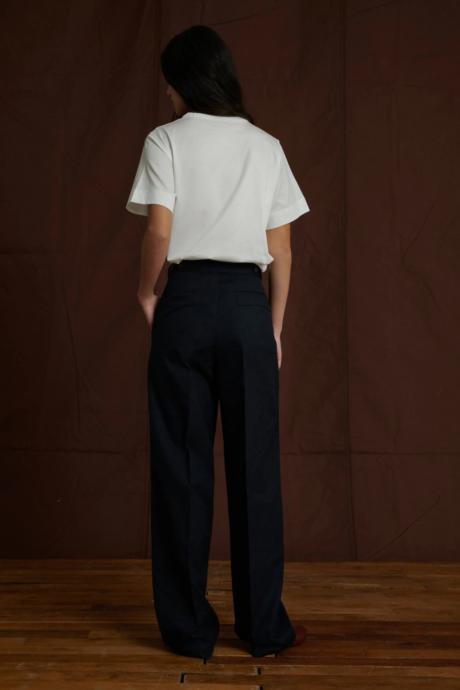 SULPICE est un pantalon Ă pinces large et droit. Une patte de boutonnage ajustable permet de le porter taille haute ou posĂ© sur les hanches. Sa toile texturĂ©e, en coton et lin, lui apporte de la tenue. Avec la veste ALFRED assortie, il constitue un costume d’Ă©tĂ© habillĂ©.