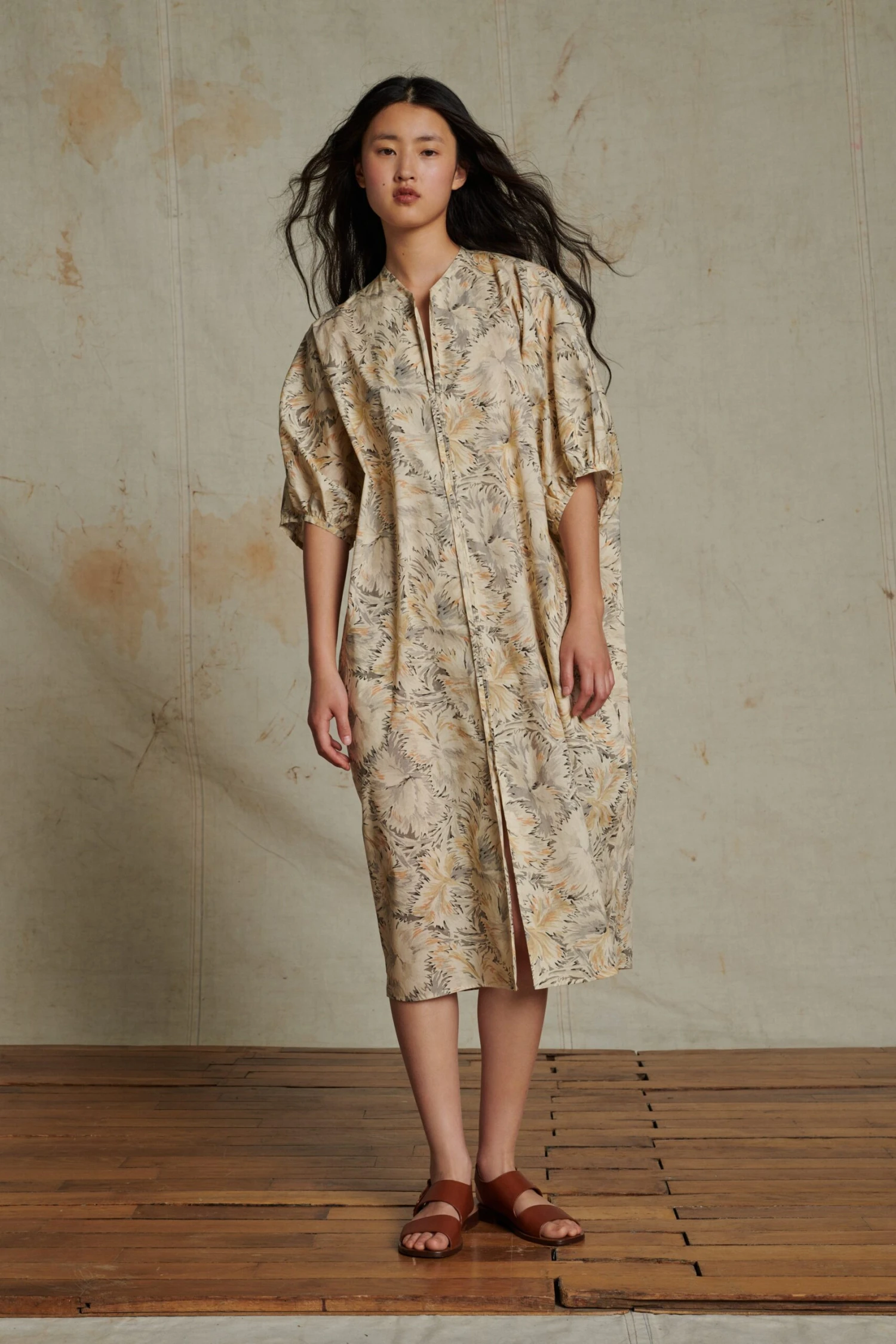 ALGER est une robe ample en coton imprimĂ© du motif « Bloom » aux nuances pastel. Les manches chauves-souris marquent une silhouette sophistiquĂ©e, accentuĂ©e par une encolure fendue en V et un jeu de fines fronces autour du col et des manches. La popeline de coton, lĂ©gĂšre et fraiche, est idĂ©ale pour l’Ă©tĂ©.