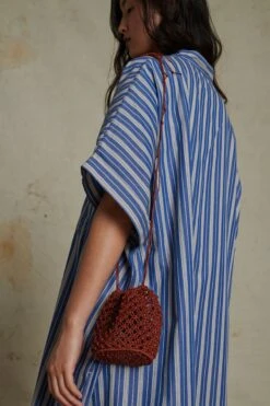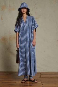 Robe ample décolletée en popeline de coton souple à fines rayures bleues et blanches