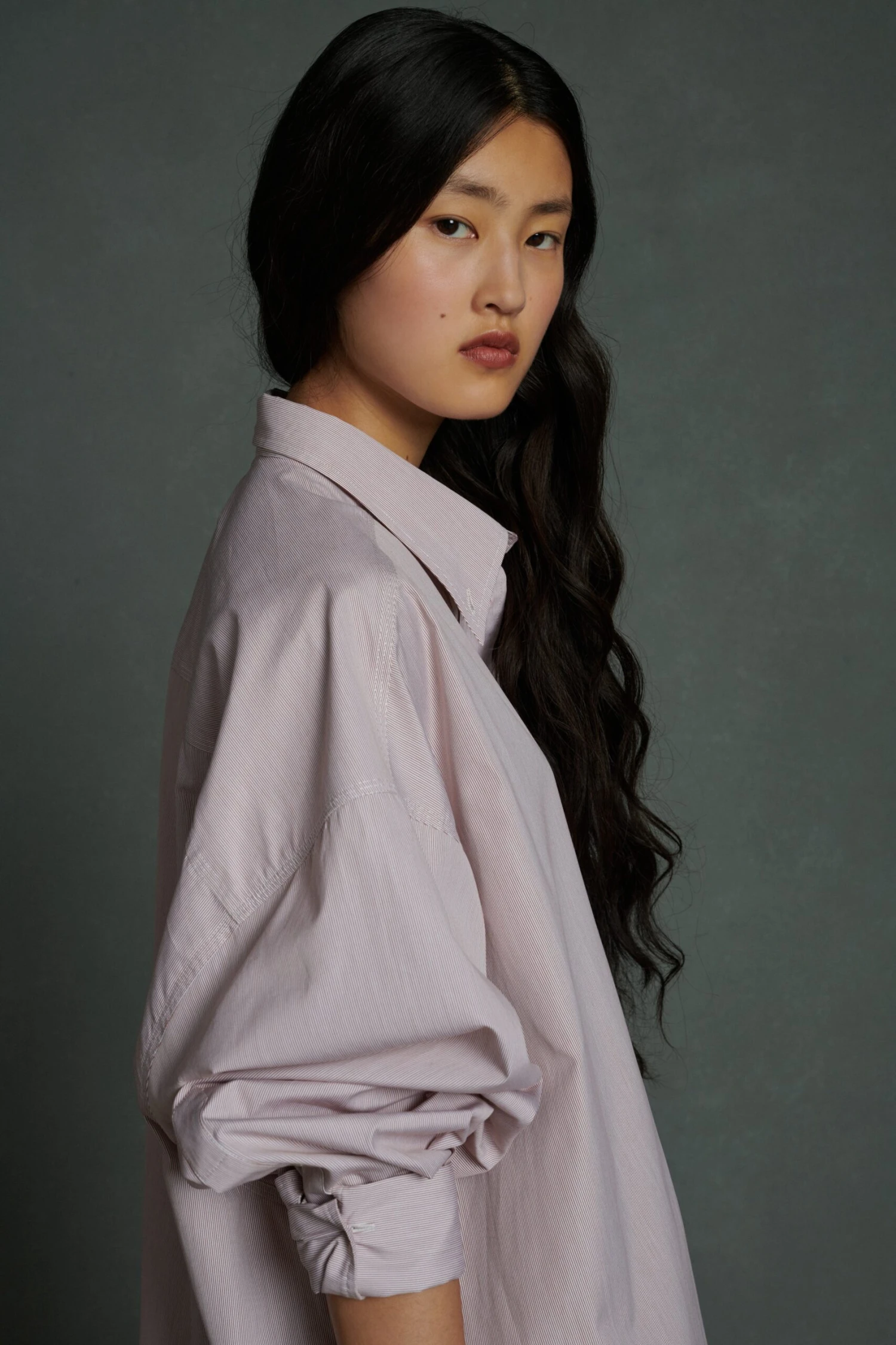 AUTRICHE est une robe-chemise oversize en popeline de coton à fines rayures. Elle dispose de nombreux détails qui la rendent singulière : col boutonné, épaules tombantes, manches XXL à revers, bas de corps liquette.
