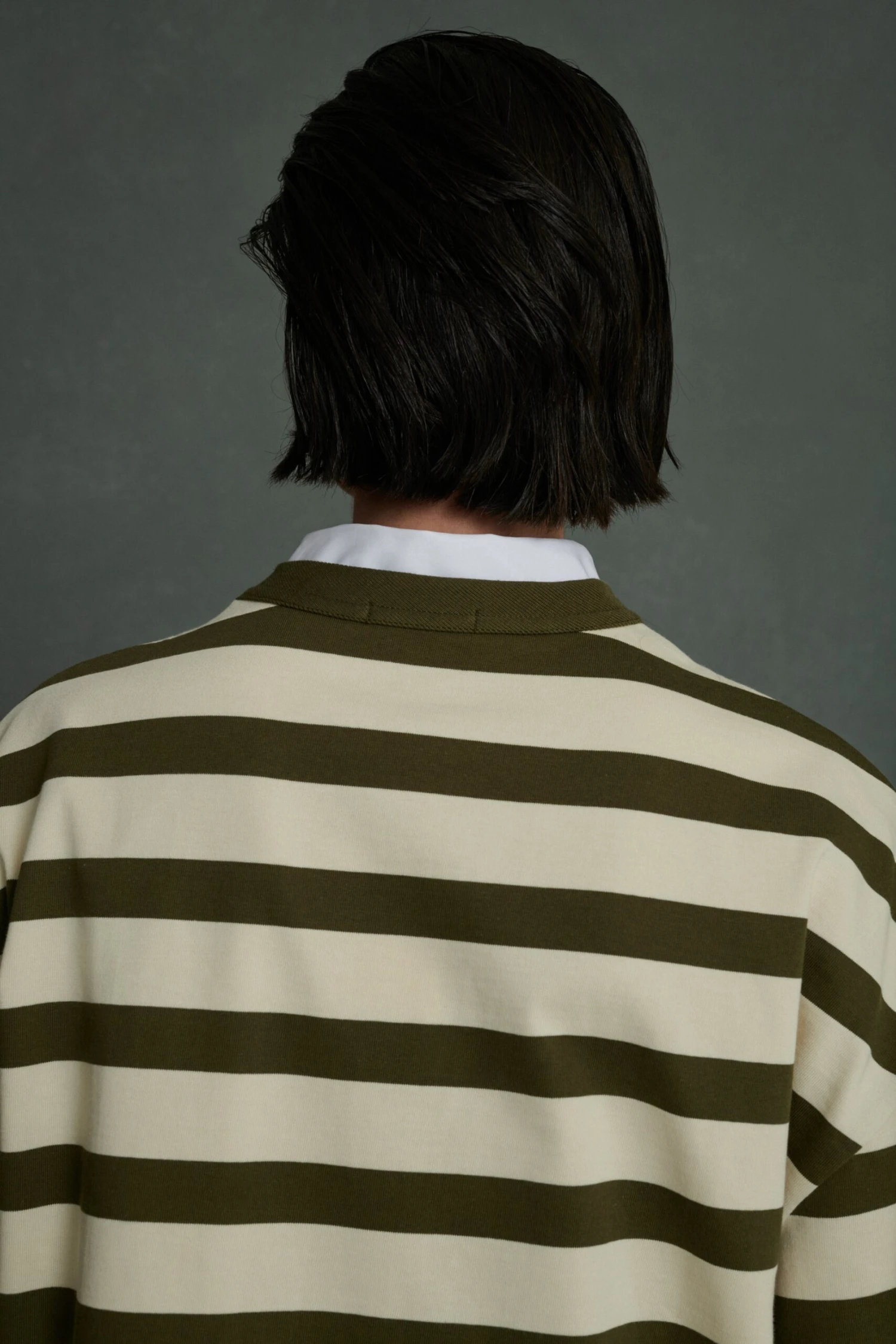 ADAM est notre nouvelle mariniĂšre. Cette version Ă larges bandes Ă©crues et kaki est proposĂ©e dans un jersey de coton biologique. Sa coupe rĂ©solument oversize se porte en t-shirt large Ă mĂȘme la peau ou en superposition comme un sweatshirt fin. Le logo « Soeur « est brodĂ© sur l’avant.