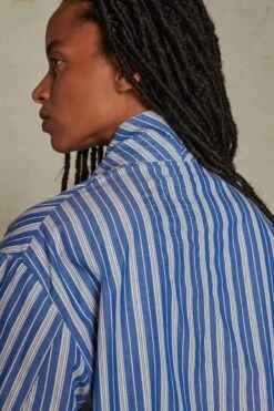 AUGUSTINE est une veste non doublée en popeline de coton à rayures blanches et bleues. Le fil de coton est émerisé, rendant la popeline plus douce, souple et confortable. A poser sur les épaules pour réchauffer une robe longue à bretelles, ou à porter en blazer avec un pantalon formel ou un jean brut.